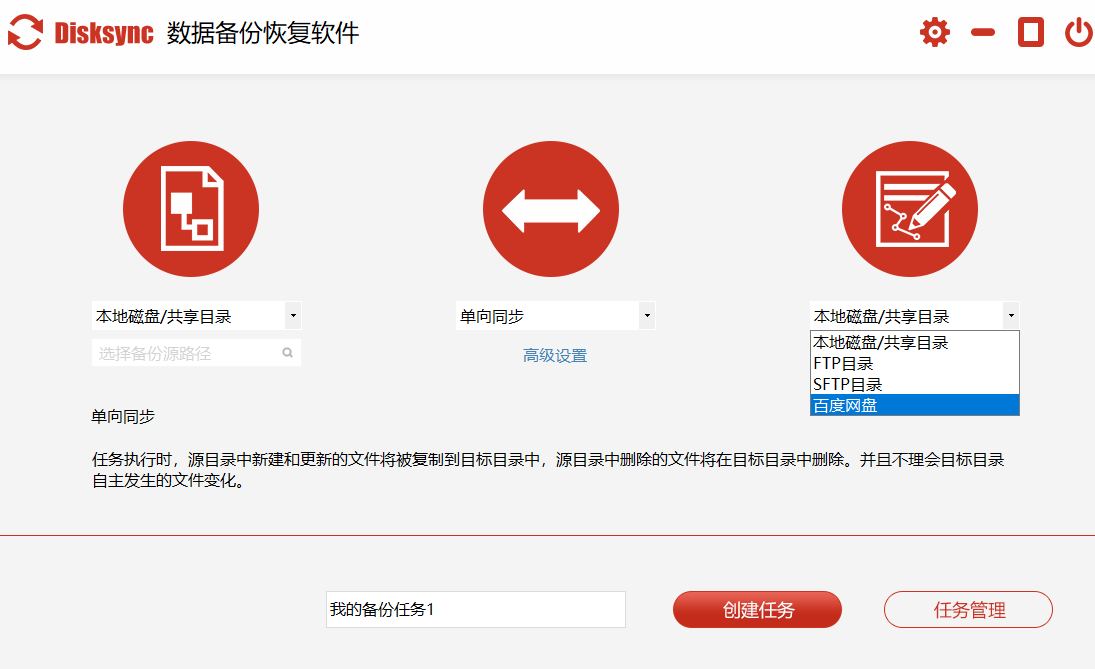 1、专业备份同步→实现本机储存设备,网络共享目录、FTP,网盘等两两之间的支持单向备份同步。支持丰富的储存介质:硬盘,USB存储器,FTP空间,百度网盘界面布局。